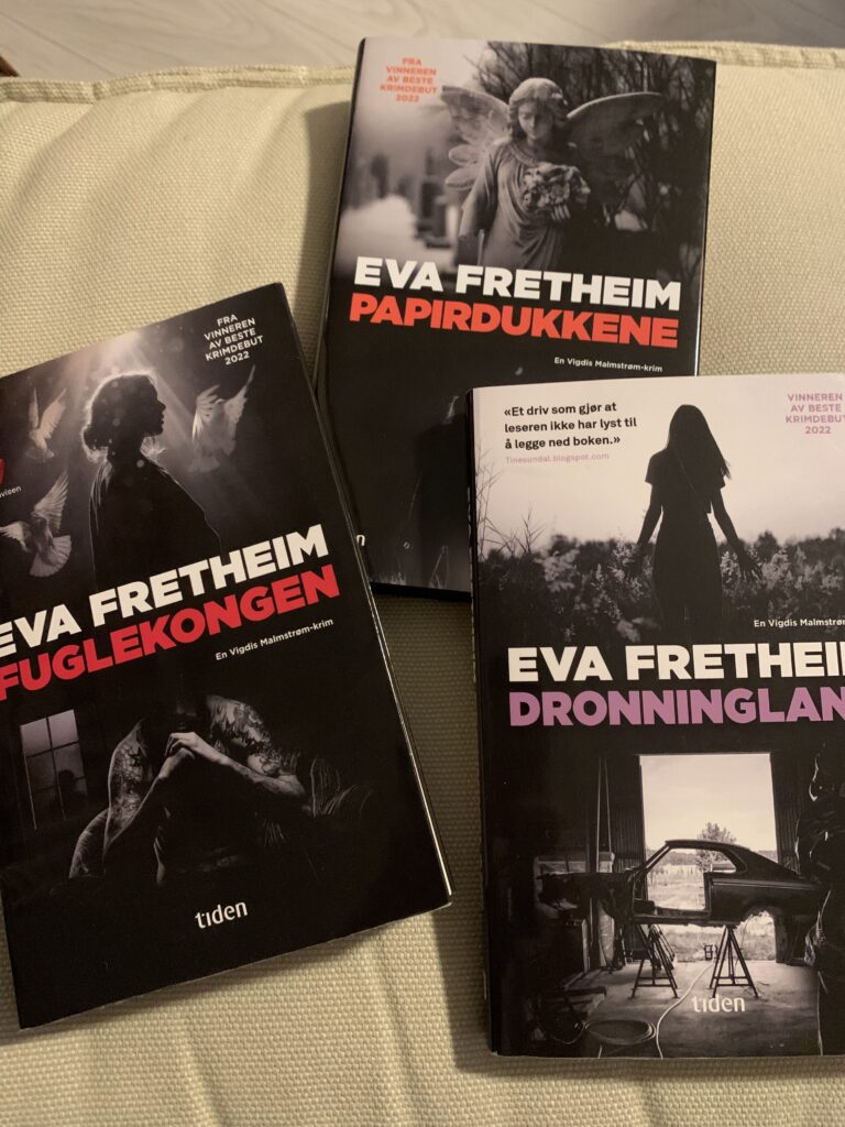Ja, det er alle 3 bøkene fra Eva Fretheims serie om Vigdis Malmstrøm. God start! «Fuglekongen» vant Riverton og Glassnøkkelen 2024. Gleder meg til å lese disse!