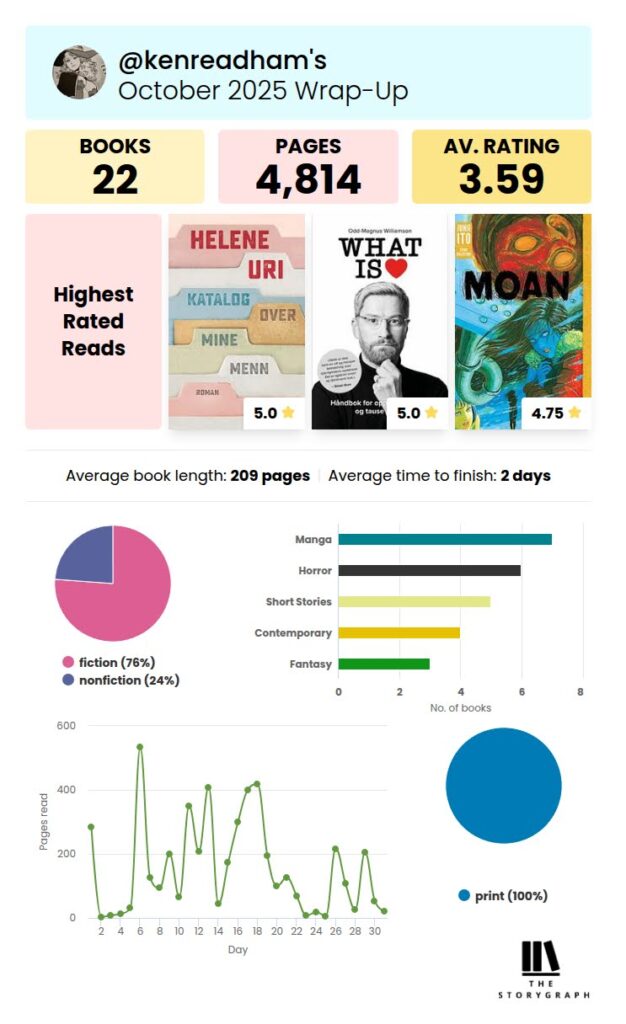I oktober rakk jeg å lese 22 bøker. Endel av dem var manga, som er relativt raskt å lese i forhold til bøker med kun tekst, men det kommer helt an på hvor mye tid man bruker på å nyte bildene.
